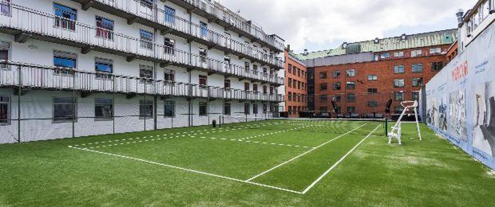 Du lejer en udendørs kunstgræs tennisbane hos Copenhagen Mercur Hotel.